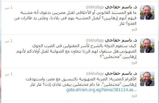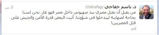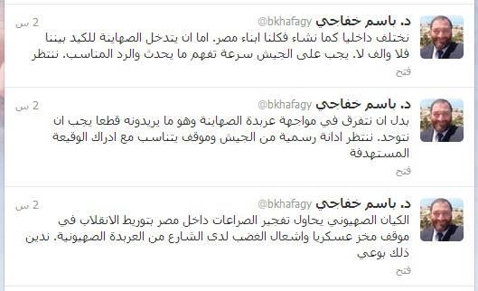 وقال خفاجي في تغريدة أخرى: من يقبل أن يقتل مصري بيد صهيوني داخل مصر فهو عار. نحن لسنا بحاجة لصهاينة ليتدخلوا في شؤوننا. أثبت البعض قدرة الأمن والجيش على قتل المصريين!