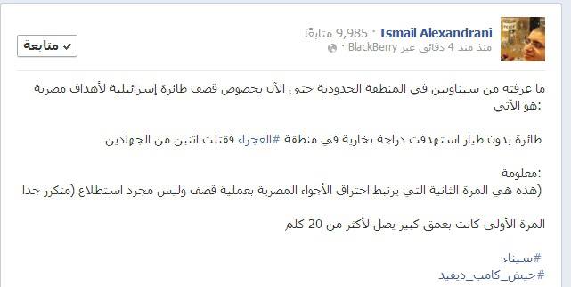 قال اسماعيل الاسكندرانى –رئيس المركز المصري للحقوق الإقتصادية والإجتماعية- :- ما عرفته من سيناويين في المنطقة الحدودية حتى الآن بخصوص قصف طائرة إسرائيلية لأهداف مصرية هو الآتي: