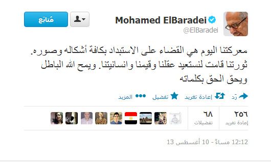 وقال البرادعي، في تدوينه له عبر تويتر، "معركتنا اليوم هي القضاء على الاستبداد بكافة أشكاله وصوره،  ثورتنا قامت لنستعيد عقلنا وقيمنا وإنسانيتنا. ويمح الله الباطل ويحق الحق بكلماته.