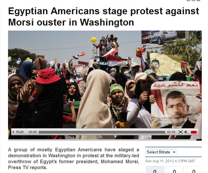 شهدت ساحة الحرية في واشنطن اليوم الأحد مظاهرة ضد الانقلاب العسكري الذي حدث في مصر، معظمهم من المصريين المقيمين في الولايات المتحدة،  مطالبين بعودة أول رئيس منتخب مصري، وفقا للموقع الرسمي لقناة "برس تي في".