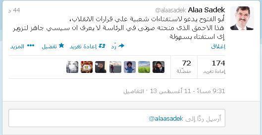 وقال صادق فى تغريدة له على موقع التواصل الاجتماعي "تويتر" :"أبو الفتوح يدعو لاستفتاءات شعبية علي قرارات الانقلاب، هذا الأحمق الذي منحته صوتي في الرئاسة لا يعرف أن سيسي جاهز لتزوير أي استفتاء بسهولة" .