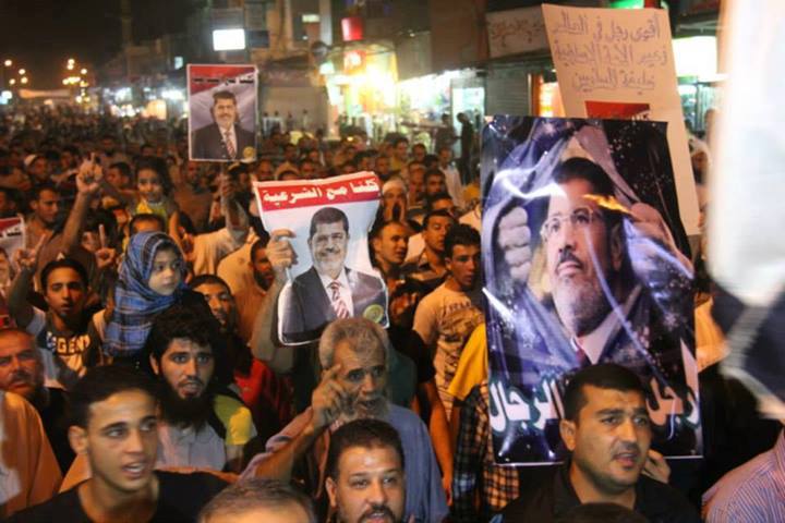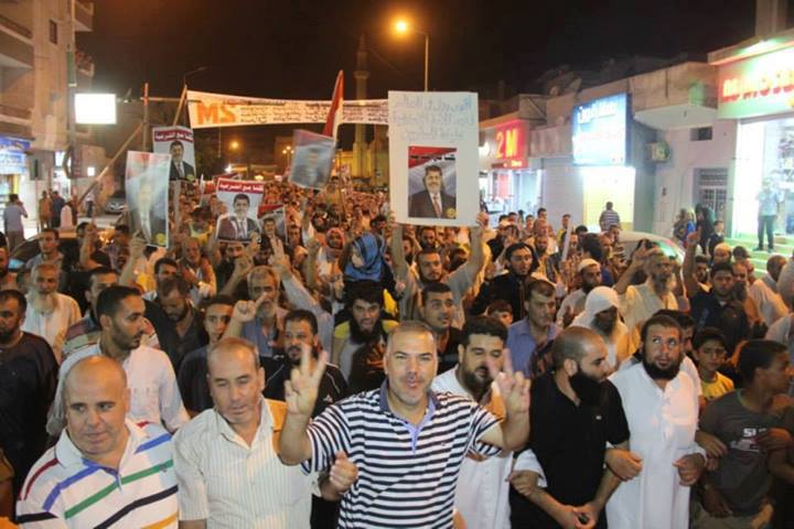 خرج الآلاف من المتظاهرين من أهالي سيناء ومن أنصار الرئيس مرسي ، مساء أمس (الأحد) من أمام منصة مسجد النصر لتحالف القوي الوطنية والثورية بشمال سيناء في مسيرة لرفض الإنقلاب العسكري ودعم الشرعية.