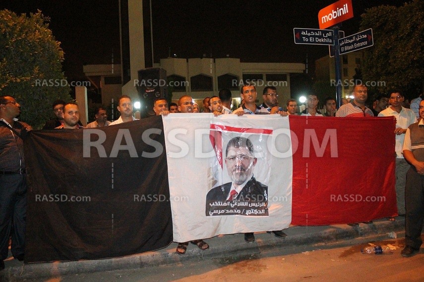 ورفع المتظاهرون صور الرئيس محمد مرسي ، وأخري مكتوب عليها "ضد الانقلاب العسكري" مرددين هتافات منادية باسقاط حكم العسكر وعودة الرئيس الشرعي.