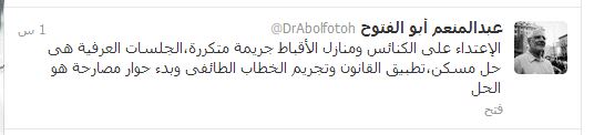 وأضاف أبو الفتوح في تغريدات له اليوم (الثلاثاء) علي موقع تويتر أن تطبيق القانون وتجريم الخطاب الطائفى وبدء حوار مصارحة هو الحل.