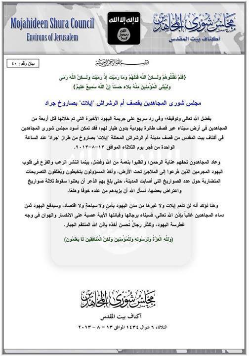 مجلس شورى المجاهدين يعلن مسؤوليته عن إطلاق صروخ جراد فجر اليوم الثلاثاء على مدينة أبو الرشراش المحتلة "إيلات" وذلك ردا على قتل أربعة من المجاهدين في أرض سيناء عبر قصف طائرة يهودية بدون طيار لهم