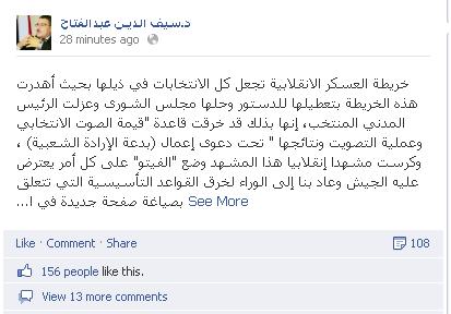 قال د. سيف عبد الفتاح استاذ العلوم السياسية بجامعة القاهرة إن خارطة العسكر الانقلابية جعلت كل الانتخابات في ذيلها وأنها بتعطيل الدستور وحل مجلس الشورى وعزل الرئيس المدني المنتخب،خرقت قاعدة "قيمة الصوت الانتخابي وعملية التصويت ونتائجها " تحت دعوى إعمال (بدعة الإرادة الشعبية) .