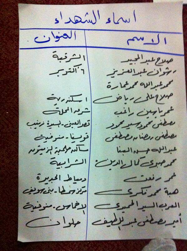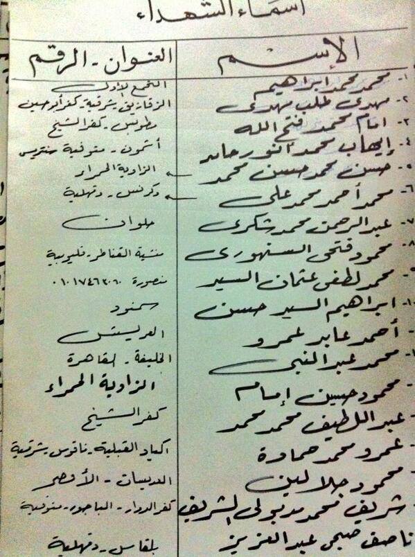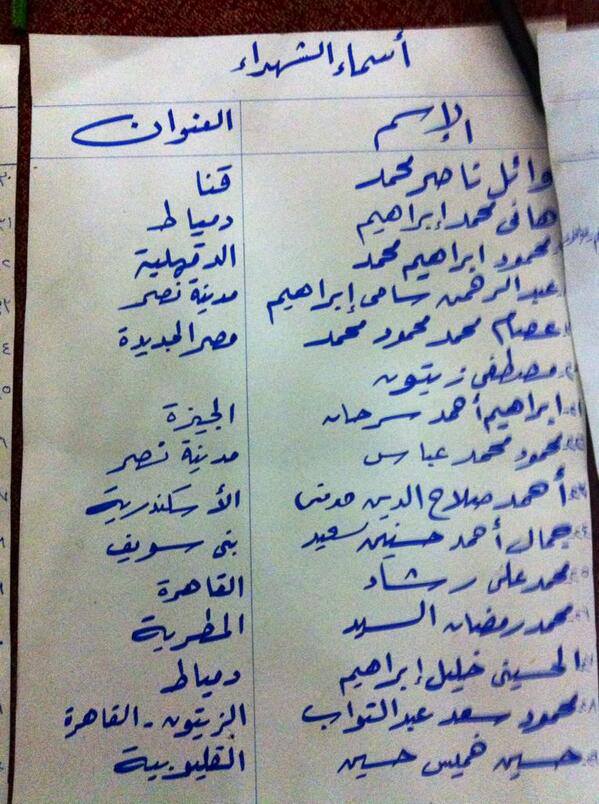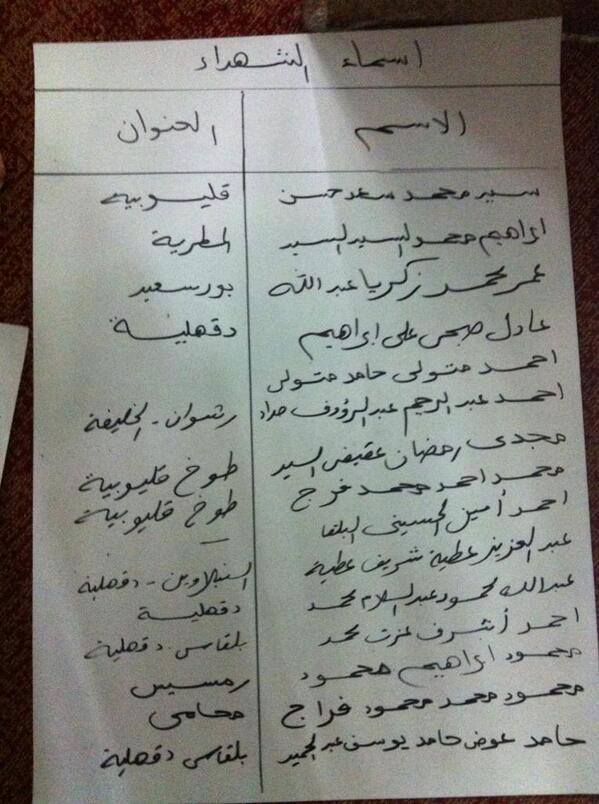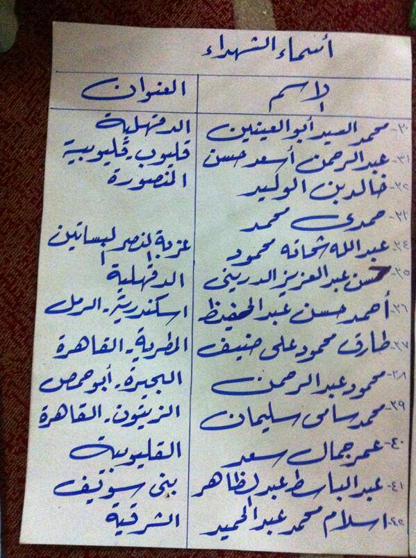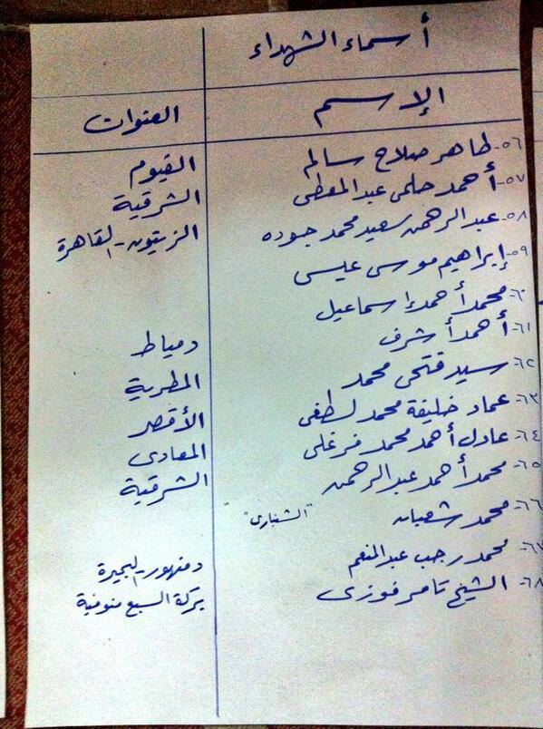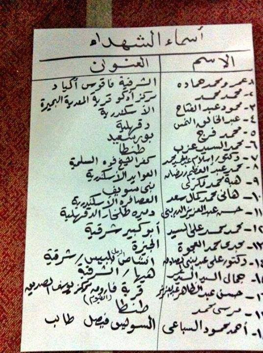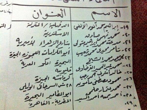 وفيما يلي بعض الكشوف التي تحتوي على أسماء الجثث التي لم يتم تسليمها إلى ذويهم.