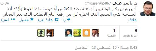 وقال علي عبر تويتر "أدين ويدين كل الوطنيين أي عنف ضد الكنائس أو مؤسسات الدولة"، مضيفا: "أؤكد أن السلمية هي المنهج الذي اختاره كل من وقف امام الانقلاب الذي يدير المجازر".