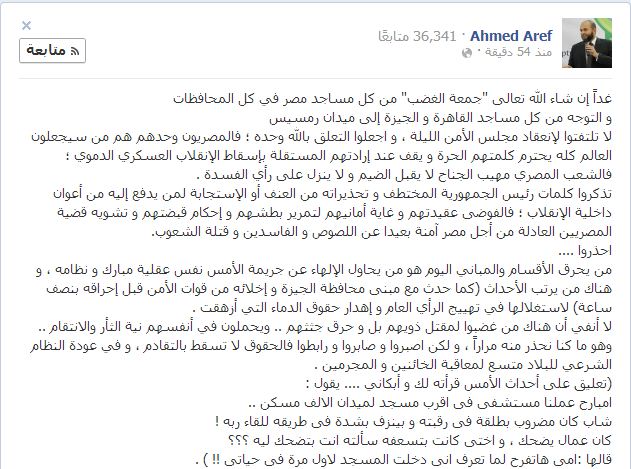 أعلن د. أحمد عارف-المتحدث الرسمي باسم الإخوان- أن غدًا ستخرج مسيرات من كل مساجد القاهرة و الجيزة إلى ميدان رمسيس في جمعة "الغضب"