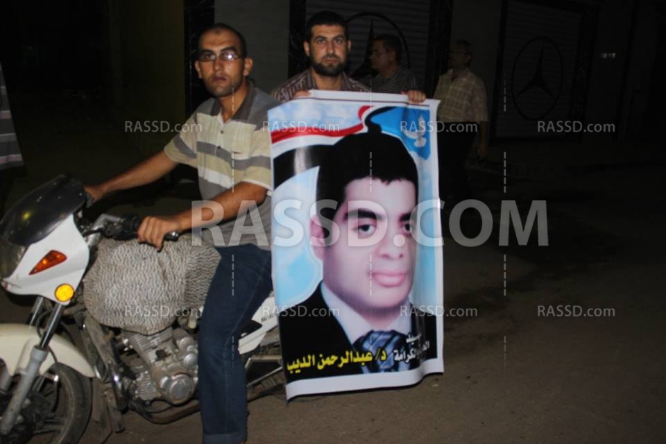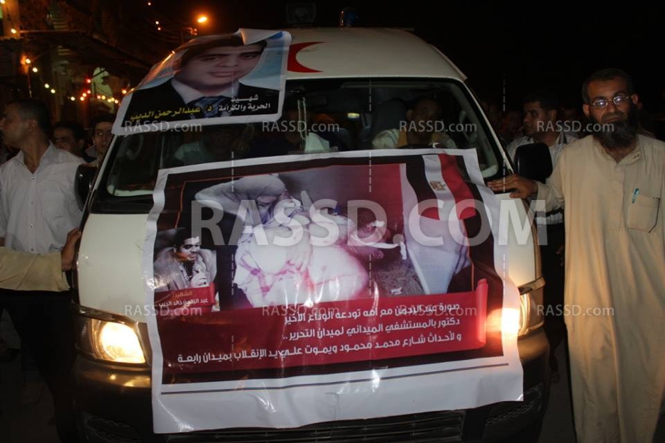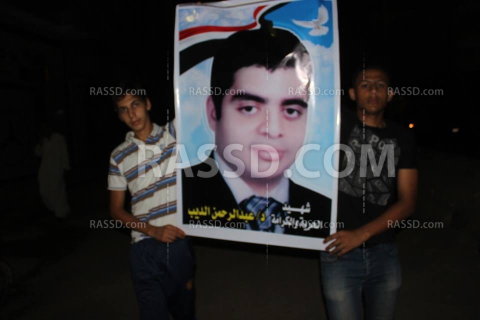 رصدت عدسة شبكة " رصد" الاخبارية صور تشييع جثمان الشهيد الدكتور عبد الرحمن خالد الديب بالمنصورة والذي استشهد في مجزرة فض اعتصام رابعة، وقد حضر الآلاف من أهالي مدينته لتشييع جنازته