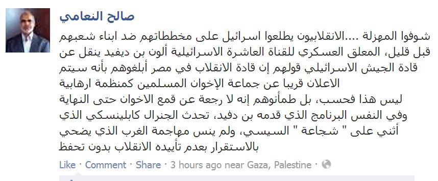 وقال النعامي إن المعلق العسكري بالقناة العاشرة الإسرائيلية ألون بن ديفيد نقل عن قادة جيش الاحتلال قولهم إن قادة الانقلاب في مصر أبلغوهم بأنه سيتم قريبا الإعلان عن جماعة الإخوان المسلمين كمنظمة ارهابية.