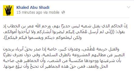 أضاف أبو شادي: " القتل جريمة عُظْمَى، وعدوان كبير، خاصة إذا صدر بحقّ أبرياء يريدون التعبير عن مطالبهم المشروعة بالطرق السلمية، وفي دول تعترف نظريًا بأن شرعيتها ووجودها مكتسبةٌ من الشعب، وأن الجماهير هي صاحبة الحل والعقد، فمن حقّ هذه الجماهير أن تحتجَّ وأن تبلِّغ صوتها".