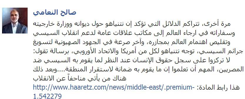 ذكر الأكاديمي الفلسطيني صالح النعامي المتخصص في الدراسات العبرية أن رئيس الوزراء الصهيوني بنيامين نتنياهو حول ديوانه ووزارة خارجيته وسفاراته حول العالم إلى مكاتب علاقات عامة لدعم انقلاب السيسي.