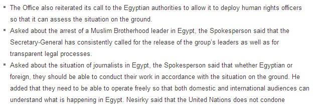 وأضاف نسيركي ردا على سؤال حول وضع الصحفيين في مصر: "يجب السماح للصحفيين على ممارسة عملهم بحرية ليتمكن الجمهور المحلي والدولي من فهم ما يحدث في مصر، الأمم المتحدة لا تغفر مضايقة الصحفيين" معتبرا أي عنف ضدهم غير مقبول.
