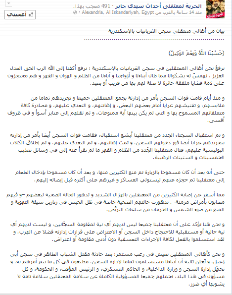 و نحن كأهالي المعتقلين نعيش في رعب مستمر؛ بعد حادثة مقتل الشباب الطاهر في سجن أبي زعبل، و نُعلن ثانية أن أبناءنا مستسلمون تماما لإدارة السجن، مطيعون في كل ما يتم أمرهم به، و نحمِّل إدارة السجن و وزارة الداخلية، و الحاكم العسكري، و الرئيس المؤقت، و الحكومة، و كل مسؤول في هذا البلد، نحملهم جميعا المسؤولية الكاملة عن سلامة المعتقلين سلامة تامة لا يشوبها أي ضرر.