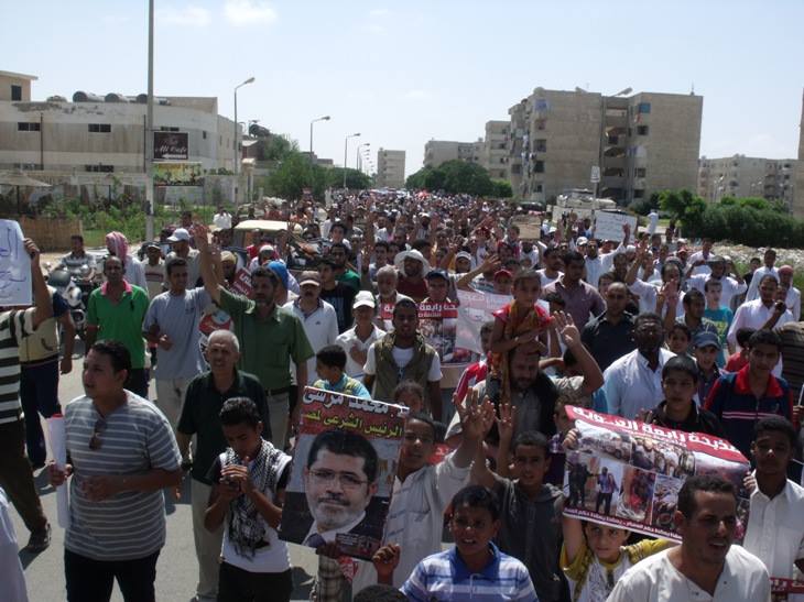 وانطلقت مسيره من مسجد االـ800 وسط مشاركه شعبيه واسعه من أهالى المدينه مرددين هتافات: " المره دى بجد ….. مش هنسبها لحد "، "اضرب نار اضرب مطاطى . احنا كرهنا الصوت الواطى"، "سيسى يا سيسى … مرسى رئيسى.