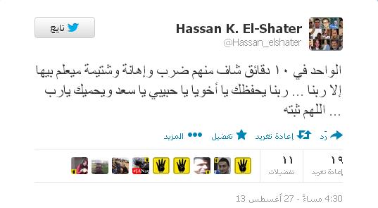 وقال حسن نجل الشاطر في تدزوينة له على موقعه على تويتر منذ قليل " تم إعتقال أخي سعد الآن بعد مداهمة قوات الأمن لبيتنا منذ دقائق اللهم إني أستودعتك أخي وأبي اللهم احفظهم بعينك التي لا تنام"