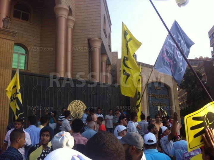 ورفع المتظاهرون رأيات رابعة علي سفارة دولة الإمارات الداعمة للانقلاب العسكري في مصر.