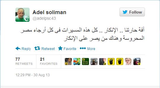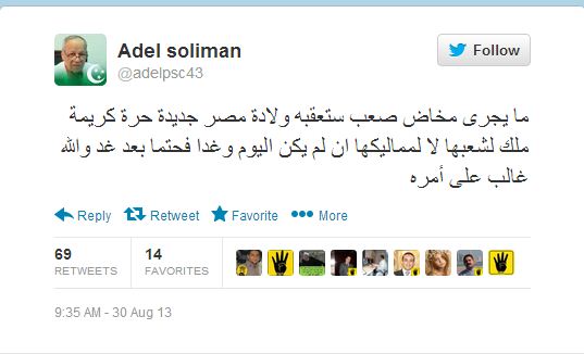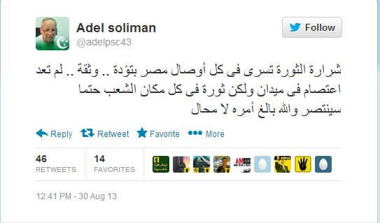 واختتم:- "شرارة الثورة تسرى فى كل أوصال مصر بتؤدة .. وثقة .. لم تعد اعتصام فى ميدان ولكن ثورة فى كل مكان الشعب حتما سينتصر والله بالغ أمره لا محال".