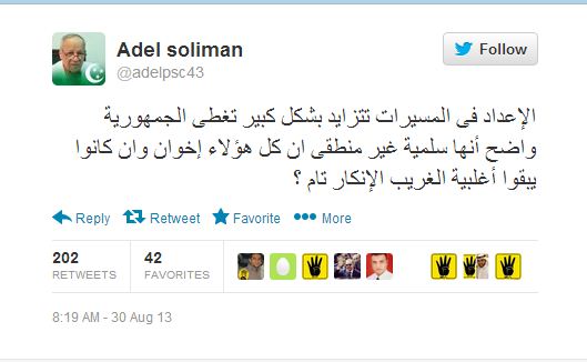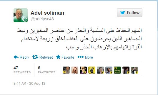 وشدد علي ضروة الحفاظ علي السلمية والحظر من عناصر المخبرين وسط الجماهير الذين يحرضون على العنف لخلق زريعة لاستخدام القوة واتهامهم بالإرهاب الحذر واجب.