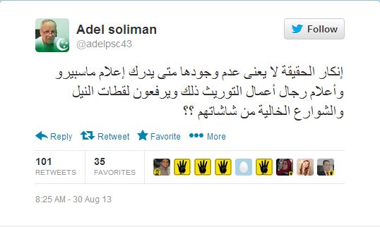وأوضح سليمان في تغريدات له علي موقع تويتر أمس (الجمعة) أن إنكار الحقيقة لا يعنى عدم وجودها متسائلا:- متى يدرك إعلام ماسبيرو وأعلام رجال أعمال التوريث ذلك ويرفعون لقطات النيل والشوارع الخالية من شاشاتهم ؟؟