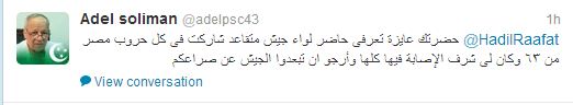 جدير بالذكر أن اللواء عادل سليمان لواء جيش متقاعد شارك فى كل حروب مصر من ٦٣ .