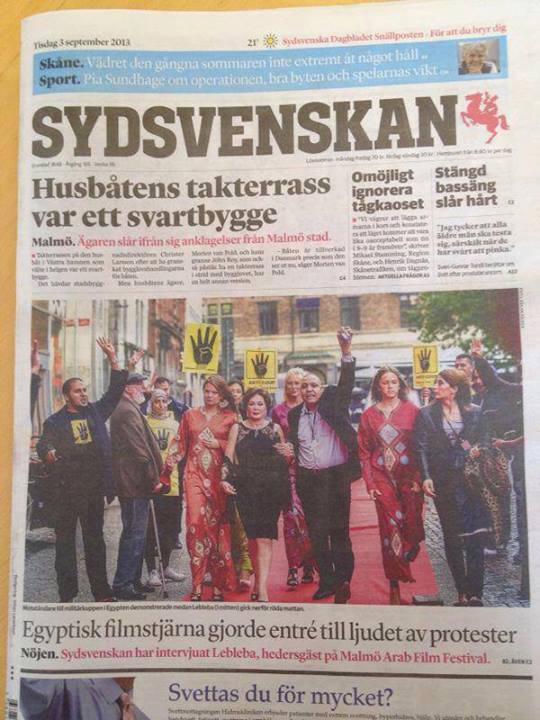 وكما فاجأ الشعب المغاربي الفنانة شيرين عبد الوهاب خلال مشاركتها فى مهرجان "تطوان" بالتصفير والضجيج ومطالبتها بالنزول عند تحيه السيسي فوجىء أيضًا الفنانين المصريين أثناء توجههم لمهرجان مالمو للأفلام العربية بجنوب السويد بالأمس، بإحاطة عدد من رافضي الانقلاب بهم رافعين علامة النصر رابعة، ومرددين شعارات مناهضة للإنقلاب العسكري والسيسي، على حسب ما ذكرت أبرزت الصفحة الأولى في صحيفة جنوب السويد "واسعة الإنتشار " أمس الثلاثاء.