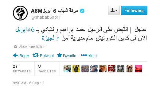 أعلنت حركة 6 أبريل عبر صفحتها على تويتر أنه تم القبض على أﺣﻤﺪ إﺑﺮﺍﻫﻴﻢ، القيادي ب6 أبريل، ﻓﻲ ﻛﻤﻴﻦ ﺍﻟﻜﻮﺭﻧﻴﺶ ﺍﻣﺎﻡ ﻣﺪﻳﺮﻳﺔ أﻣﻦ الجيزة.