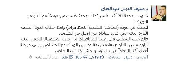قال د. سيف عبدالفتاح – أستاذ العلوم السياسية بجامعة القاهرة- عبر الفيس أن جمعة 30 أغسطس وجمعة 6 سبتمبر شهدت عودة أهم الظواهر الثورية عن عودة (الحاضنة الشعبية للمظاهرات) ولفظ خطاب الدولة العنيف الكاره الذي حض على معاداة جزء أصيل من الشعب.