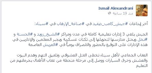 وقال الأسكندراني خلال تدوينة له عبلي صفحته الشخصية علي موقع الفيسبوك اليوم (الأثنين):- آخر إبداعات جيش كامب ديفيد في صناعة لإرهاب ..الجيش يلغي 3 إدارات تعليمية كاملة في مدن ومراكز الشيخ_زويد و الحسنة و نخل ويحتل مدارسها لتحويلها إلى ثكنات عسكرية ويجبر المعلمين والإداريين في هذه الإدارات على التوقيع بالحضور والانصراف يومياً في العريش العاصمة.