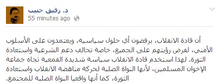 وقال حبيب عبر صفحته الرسمية على "فيسبوك" اليوم الثلاثاء: "إن قادة الانقلاب، يرفضون أي حلول سياسية، ويعتمدون على الأسلوب الأمني، لفرض رؤيتهم على الجميع، خاصة تحالف دعم الشرعية واستعادة الثورة. لهذا استخدم قادة الانقلاب سياسة شديدة القمعية تجاه جماعة الإخوان المسلمين، لأنها النواة الصلبة لحركة مناهضة الانقلاب واستعادة الثورة، كما أنها واقعيا النواة الصلبة للمجتمع".