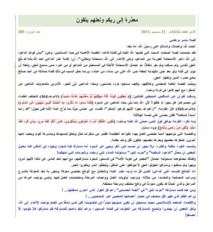 وأوضح برهامي، "رغم الظلم الذي ظهر لكل منصف في اختيار أعضائها المعينين غير المنتخبين، والإقصاء المتعمد للإسلاميين، بحيث يستحيل أن يكون صوتهم مؤثرًا في التصويتي لكن ليس مانعًا من القيام بواجب الأعذار إلى الله، ولعل البعض أن يهتدي ولتمنع المشاركة من التطرف في كتابة الدستور؛ بزعم أنكم دعيتم للمشاركة فلم تشاركوا فلا تلوموا إلا أنفسكم!".