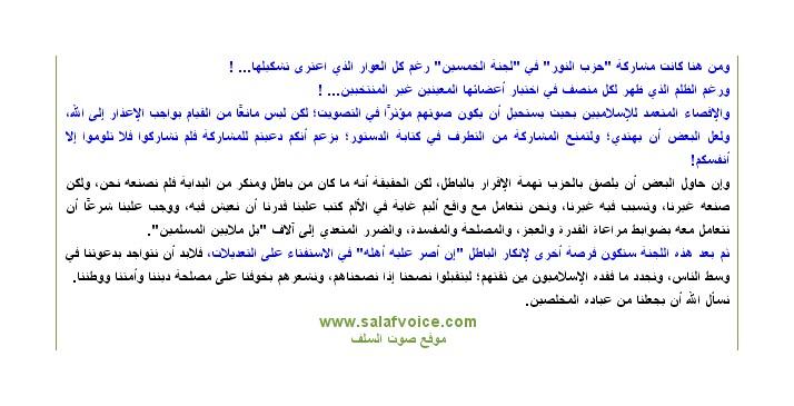 وختم بيانه فقال "ثم بعد هذه اللجنة ستكون فرصة أخرى لإنكار الباطل، إن أصر عليه أهله، في الاستفتاء على التعديلات، فلابد أن نتواجد بدعوتنا في وسط الناس، ونجدد ما فقده الإسلاميون مِن ثقتهم ليتقبلوا نصحنا إذا نصحناهم، ونشعرهم بخوفنا على مصلحة ديننا وأمتنا ووطننا".