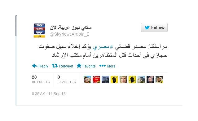 وبحسب صفحة القناة الرسمية "مراسلتنا: مصدر قضائي مصري يؤكد إخلاء سبيل صفوت حجازي في أحداث قتل المتظاهرين أمام مكتب الإرشاد".