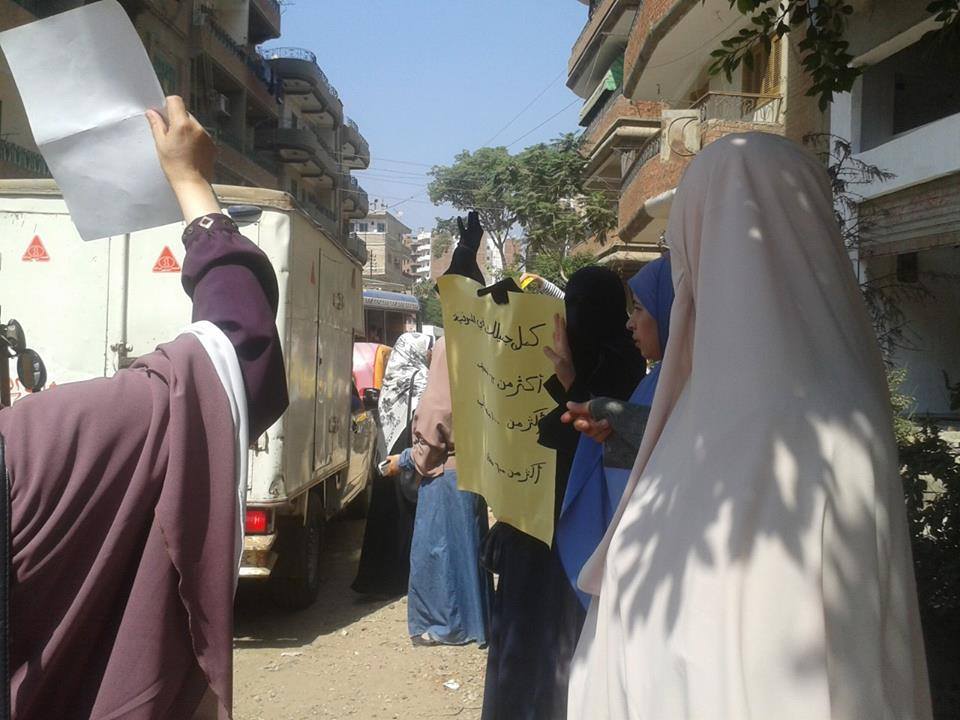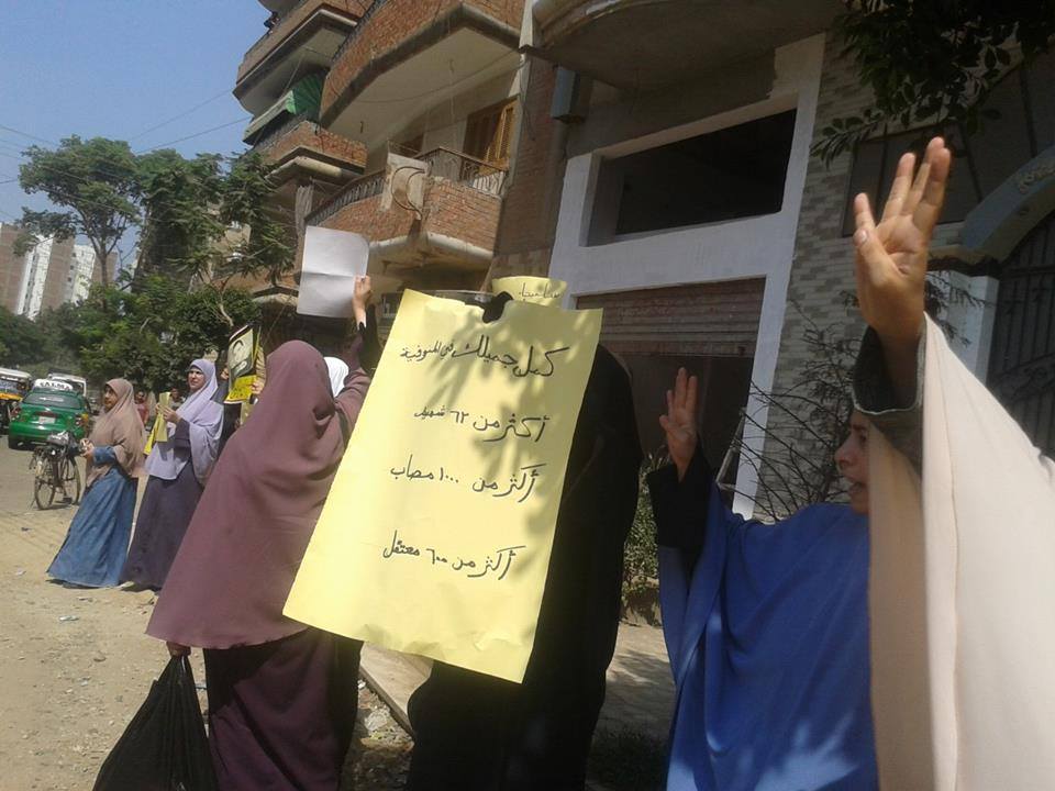 ورفع المتظاهرات لافتات تندد باعتقال النساء وقتلهن واعتقال ازواجهن وابنائهن ومنها انا مصرية مش ارهابية لا لإعتقال النساء لا للانقلاب العسكرى نعم للشرعية ثورتنا ثورة سلمية"،"قتلوا أخويا وحرقوا الجثة"،"ممكن أختلف معك.. لكن كلنا ضد العسكر"،"مش بنخاف مش بنطاطي"..