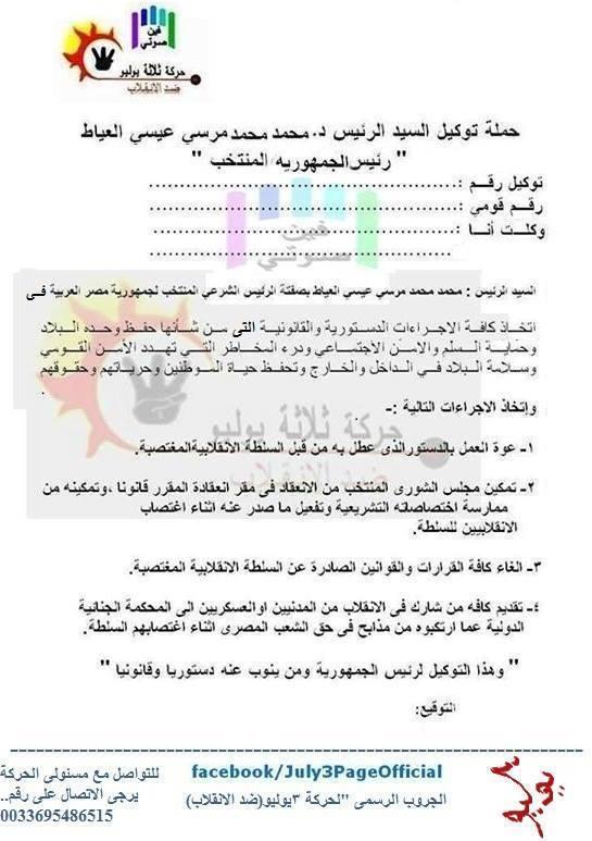 دشن عدد من النشطاء على موقع التواصل الاجتماعي «فيسبوك» دعوة لجمع توكيلات لتفويض الرئيس محمد مرسي – الرئيس الشرعي المنتخب – لإنهاء الانقلاب العسكري وما ترتب عليه من آثار ومحاكمة الانقلابيين.