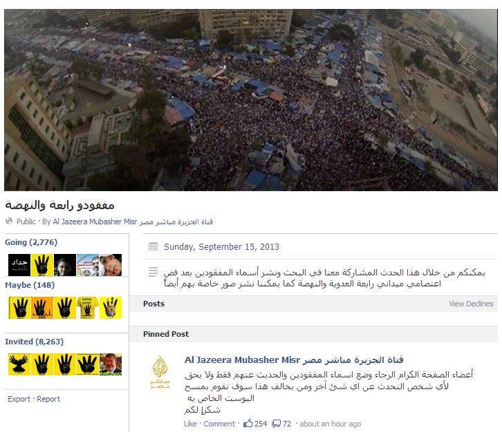 أعلنت  قناة الجزيرة مباشر مصر صفحة على موقع التواصل الاجتماعى " فيس بوك" جمع وحصر أسماء "مفقودي رابعة العدوية".