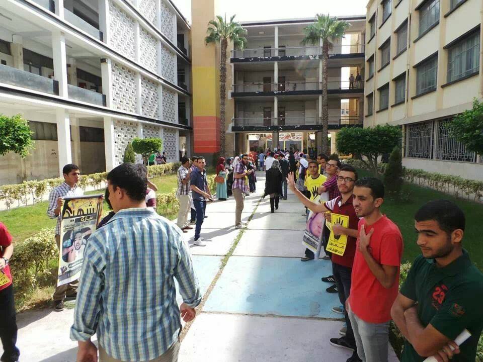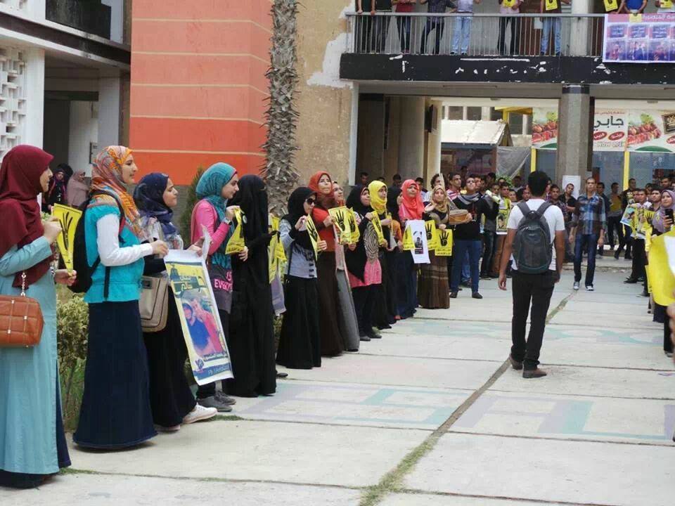 نظم طلاب جامعة المنصورة اليوم السبت سلسله بشرية مطالبين بالإفراج عن زملائهم المعتقلين و منددين بالانقلاب العسكري .
