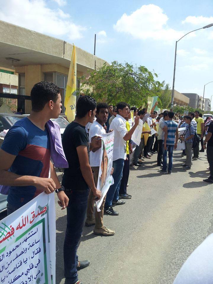 ورفع الطلاب المشاركون في الوقفة شارات رابعة الصمود ولافتات مناهضة للانقلاب العسكري ومنددة بالحملات القمعية التي تقوم بها قوات الانقلاب ضد الطلاب الرافضين لحكم العسكر، وصور لرئيس الجمهورية المختطف د. محمد مرسي وصور الطلاب الشهداء والمعتقلين.