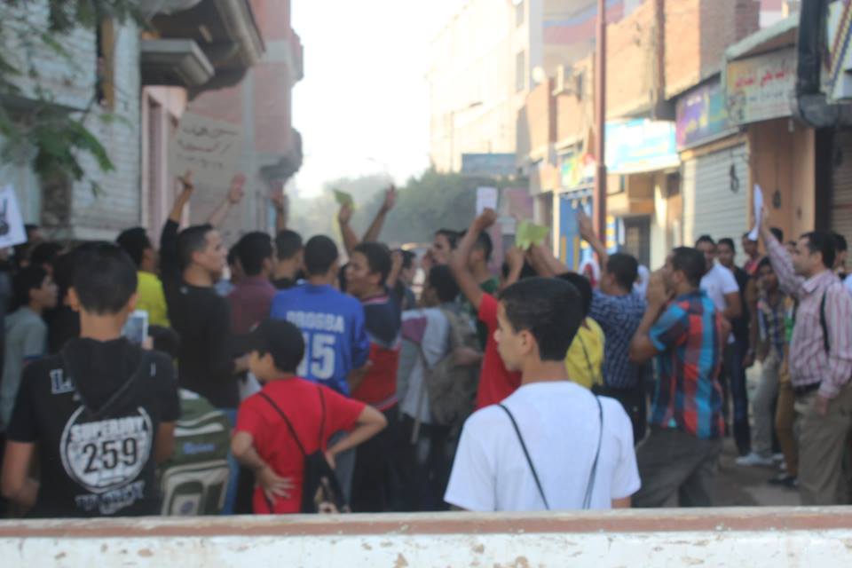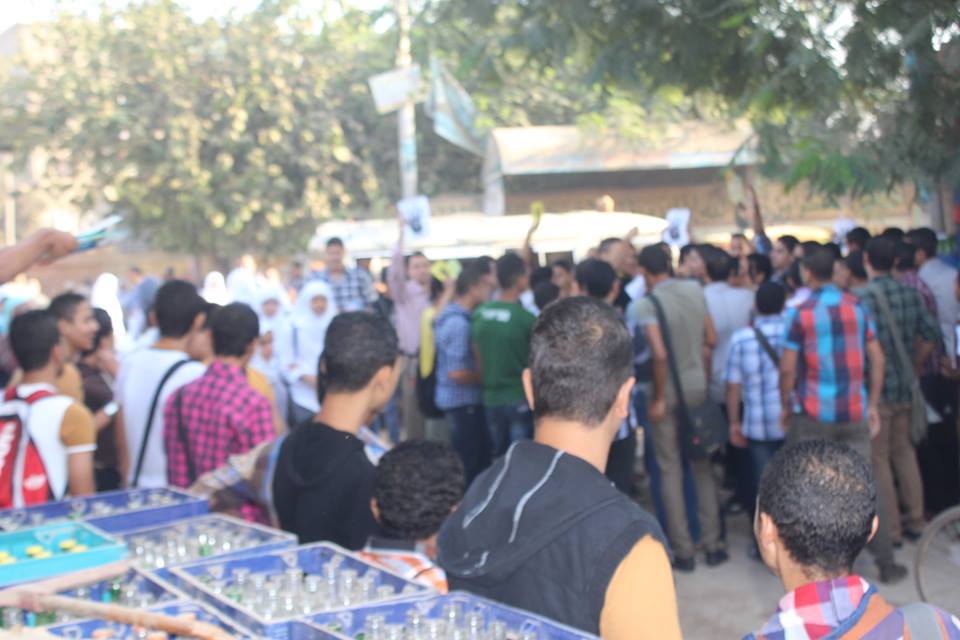 رفع الطلاب شارات رابعة العدوية واعلام مصر وصور الرئيس محمد مرسى ولافتات تندد بمجازر الانقلابيين وصور لشهداء سرس الليان.
