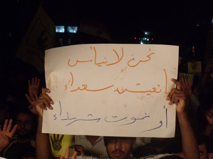 ورفع المشاركون لاقتات رابعه و أخرى مكتوب عليها "لا للانقلاب", مرددين هتافات "مهما تفكر مهما تكرر مش راح يرجع حكم العسكر" , "احنا لسه فى الميدان راجعه الثوره زى زمان ؛ مكملين ومش خايفين ".