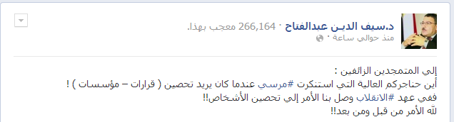ووجه رسالة لما سماهم المتمجدين الزائفين:- أين حناجركم العالية التي استنكرت مرسي عندما كان يريد تحصين ( قرارات – مؤسسات ) ! ففي عهد الانقلاب وصل بنا الأمر إلي تحصين الأشخاص .زلله الأمر من قبل ومن بعد!!"