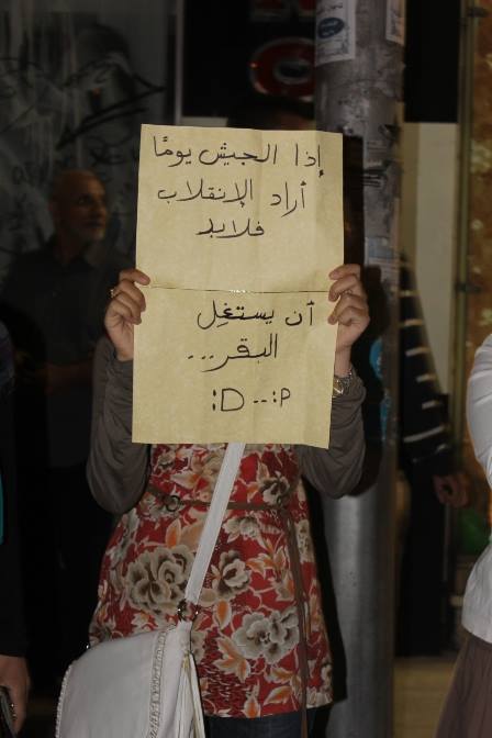 وردد المتظاهرون هتافات منها" يسقط يسقط حكم العسكر" , رافعين لافتات مرسوم عليها اشارات رابعة و " إذا الجيش اراد يوما الانقلاب فلابد ان يستغل البقر" .