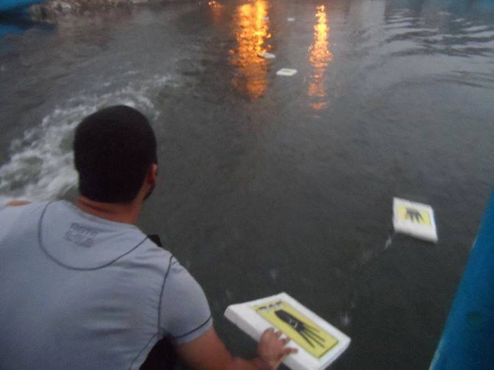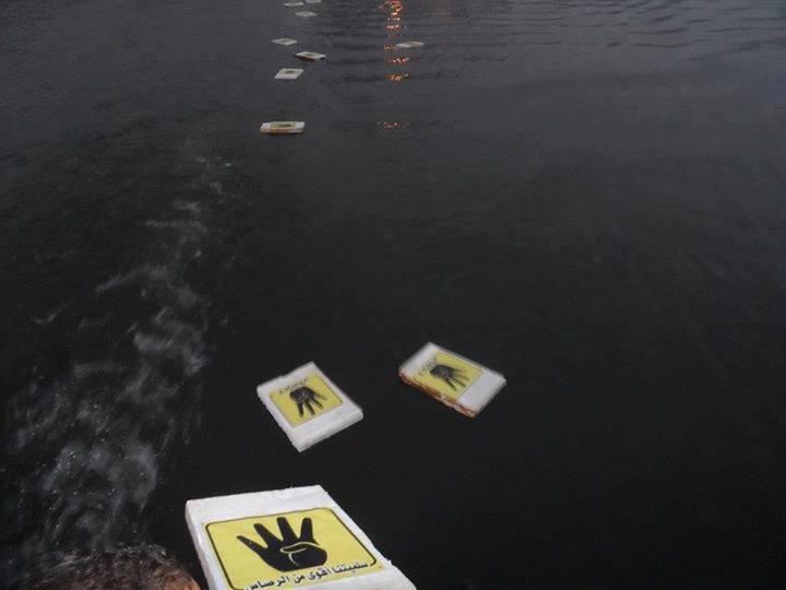 قامت عفاريات ضد الإنقلاب برمى علامات رابعة فى النيل الواصل بين زفتى غربية وميت غمر دقهلية.