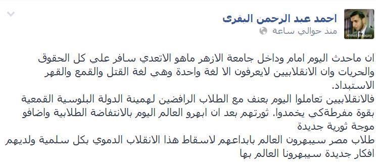 وقال البقري، عبر حسابه على الفيس بوك منذ قليل،" أن ماحدث اليوم أمام وداخل جامعة الازهر ماهو الاتعدي سافر علي كل الحقوق والحريات وأن الانقلابيين لايعرفون إلا لغة واحدة وهي لغة القتل والقمع والقهر الاستبداد…فالانقلابيين تعاملوا اليوم بعنف مع الطلاب الرافضين لهمينة الدولة البلوسية القمعية بقوة مفرطة كي يخمدوا ثورتهم بعد أن أبهرو العالم اليوم بالانتفاضة الطلابية وأضافو موجة ثورية جديدة".