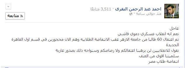 وقال في تدوينة له علي صفحته علي موقع "الفيسبوك" اليوم (الأحد) : نعم أنه انقلاب عسكري دموي فاشي ..تم اعتقال 60 طالبا من جامعة الازهر عقب الانتفاضة الطلابيه وهم الأن محجوزين في قسم أول القاهرة الجديدة ".