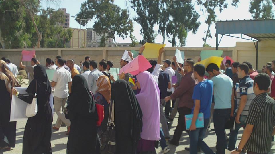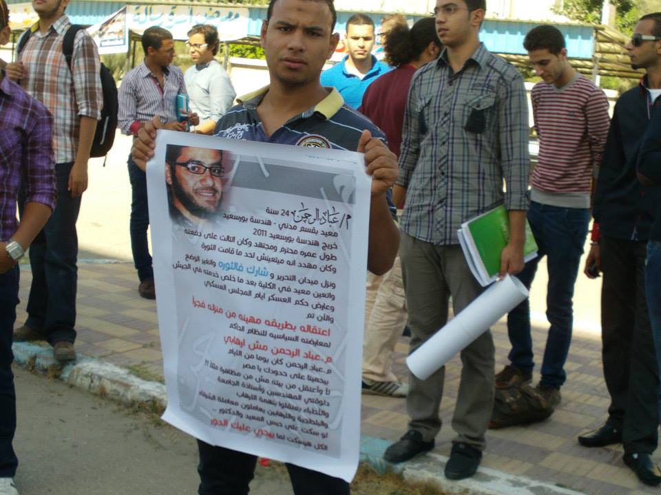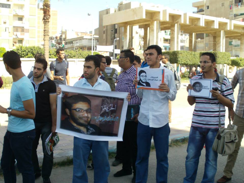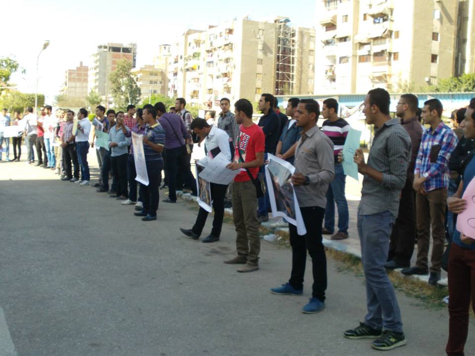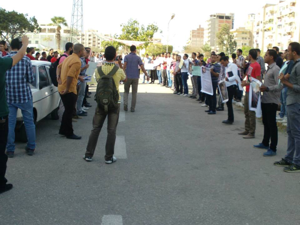 نظم أساتذة وطلاب كلية الهندسة بجامعة بورسعيد وقفتهم الاحتجاجية الثانية للمطالبة بالإفراج عن المعيد المعتقل ورفع المشاركون لافتات تحمل صور المعتقلين وترفض القمع الذي يمارسه أمن الانقلاب .