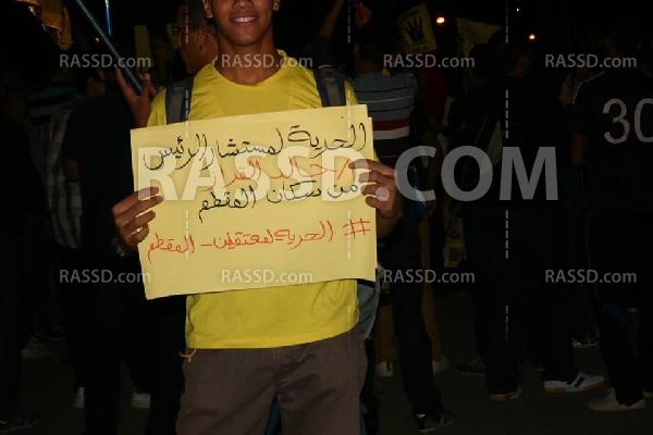 حيث انطلقت مسيرة لرافضي الانقلاب من أمام مسجد النصر بالمقطم، رافعين صور الشهداء، ولافتة تتطلب بإطلاق سراح مستشاؤ الرئيس محمد مرسي، خالد القزاز.