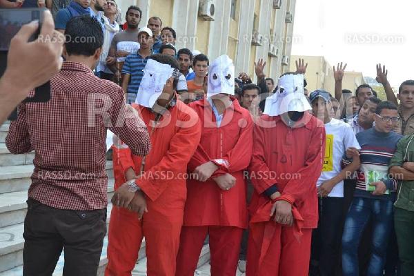 كما قام ثلاثة من طلاب جامعة الأزهر بالقاهرة المشاركين فى التظاهرت داخل الحرم الجامعى بالقاهرة بإرتداء بدل الإعدام الحمراء بشكل رمزى وغطوا وجوههم بورق مكتوب على كلا منها" السيسى"، و"الطيب"، و"ابراهيم" فى اشارة منهم إلى وزير الدفاع ووزير الداخلية، وشيخ الأزهر،لكونهم شاركوا فى الانقلاب العسكرى، والمجازر التى ارتكبت ضد المتظاهرين المؤيدين للشرعية.