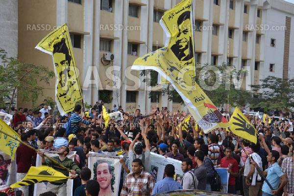 وحمل الطلاب اعلام عليها صور الشهداء وأعلام رابعة العدوية ورددوا هتافات مناهضة لحكم العسكر ووزارة الداخلية.